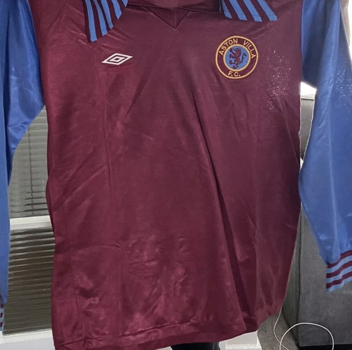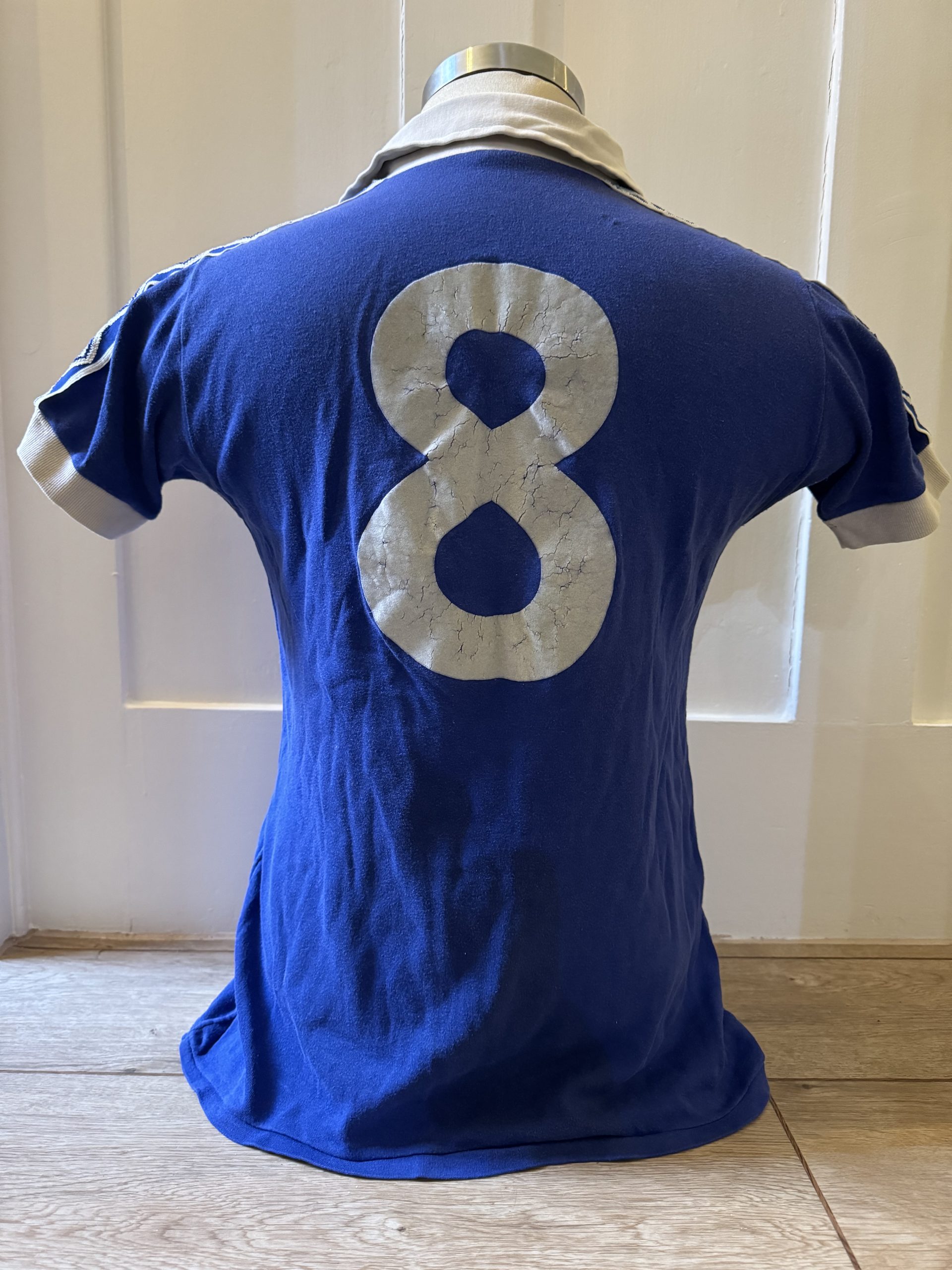 Just to clarify the authenticity. The number on this particular shirt was issued to many clubs with Umbro playing kit. This number type wasn’t fit for purpose and deteriorated quite quickly. Some clubs decided to resort to the previous seasons cotton number and had them stitched over the flock version (see pics) other clubs changed the number completely to a more modified version containing a coloured border. Also attached in pics is an Aston Villa version from 1980.